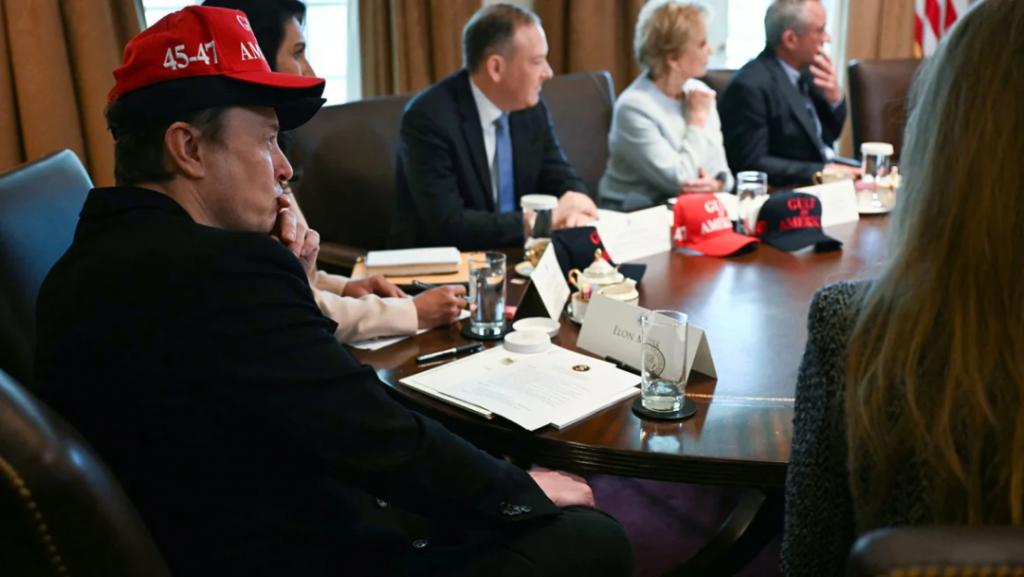 2025 年 4 月 30 日,华盛顿特区白宫内阁会议室,内阁成员举行会议中马斯克戴着两顶帽子
