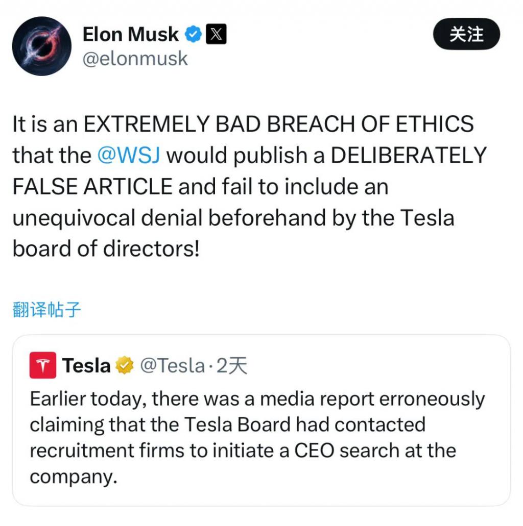 随后,马斯克和特斯拉董事会主席罗宾 · 德诺姆(Robin Denholm)发表社交媒体帖文,称该报道 " 绝对错误 "。德诺姆说," 董事会对马斯克继续执行未来令人兴奋的增加计划的能力充满信心。"