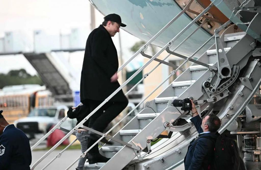 2025 年 4 月 13 日,埃隆 · 马斯克和他的儿子在棕榈滩国际机场登上空军一号 / 图源:视觉中国