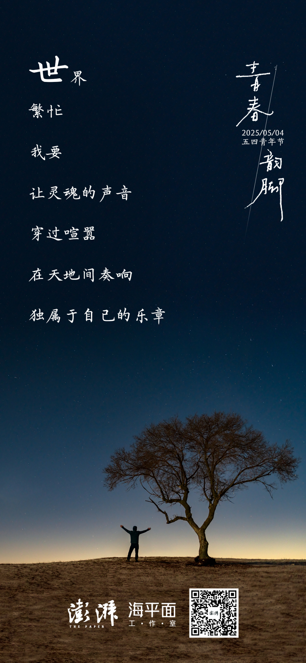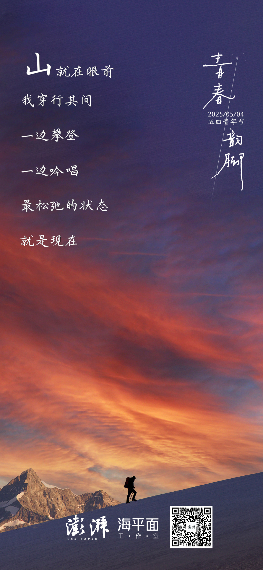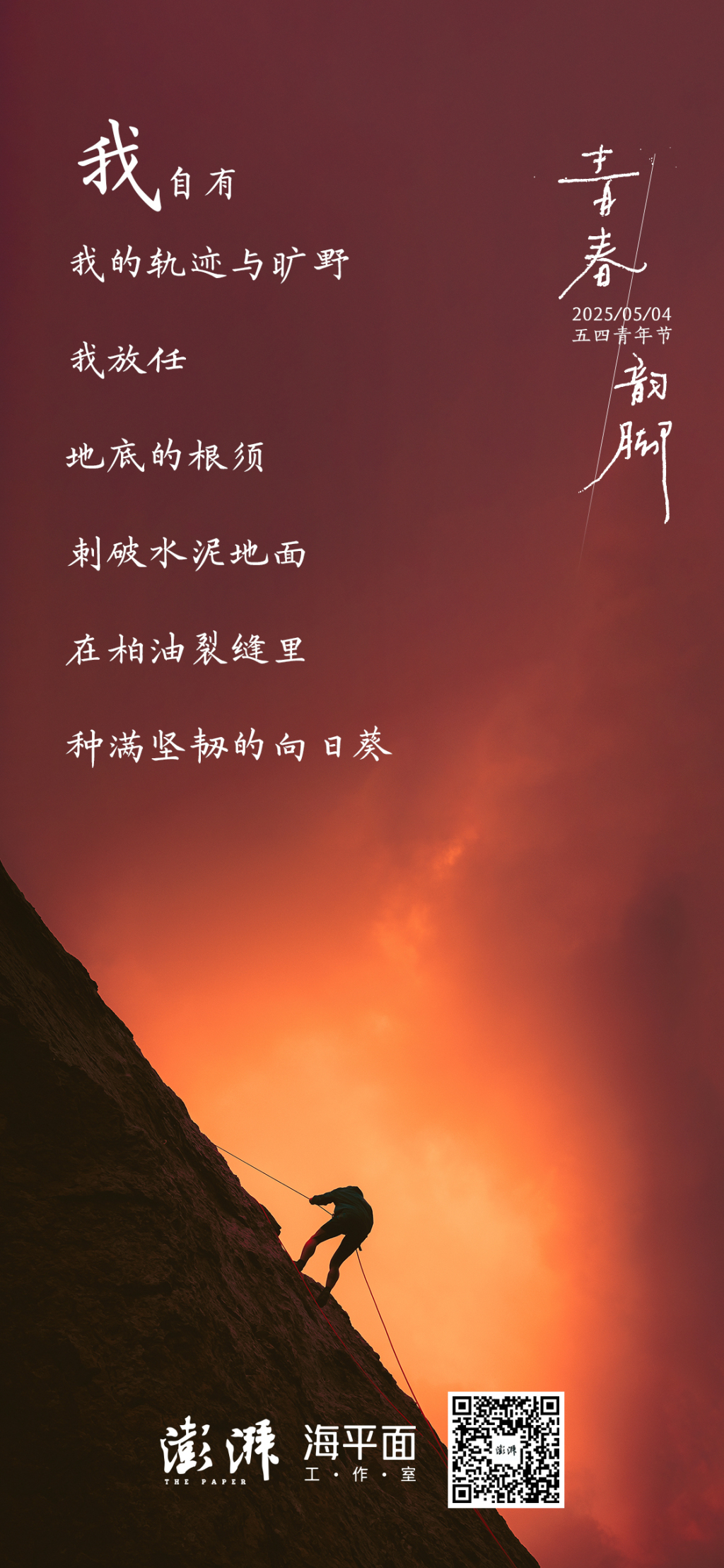 首页 > 学习 五四青年节|青春韵脚 五四青年节,这个属于青年的特殊日子。青年不是被形容词修饰的宾语,而是奔涌不息的现在进行时,是等待破茧的未知变量。撕去他人的定义,青春的韵脚,在时代的宣纸上,落笔成诗。