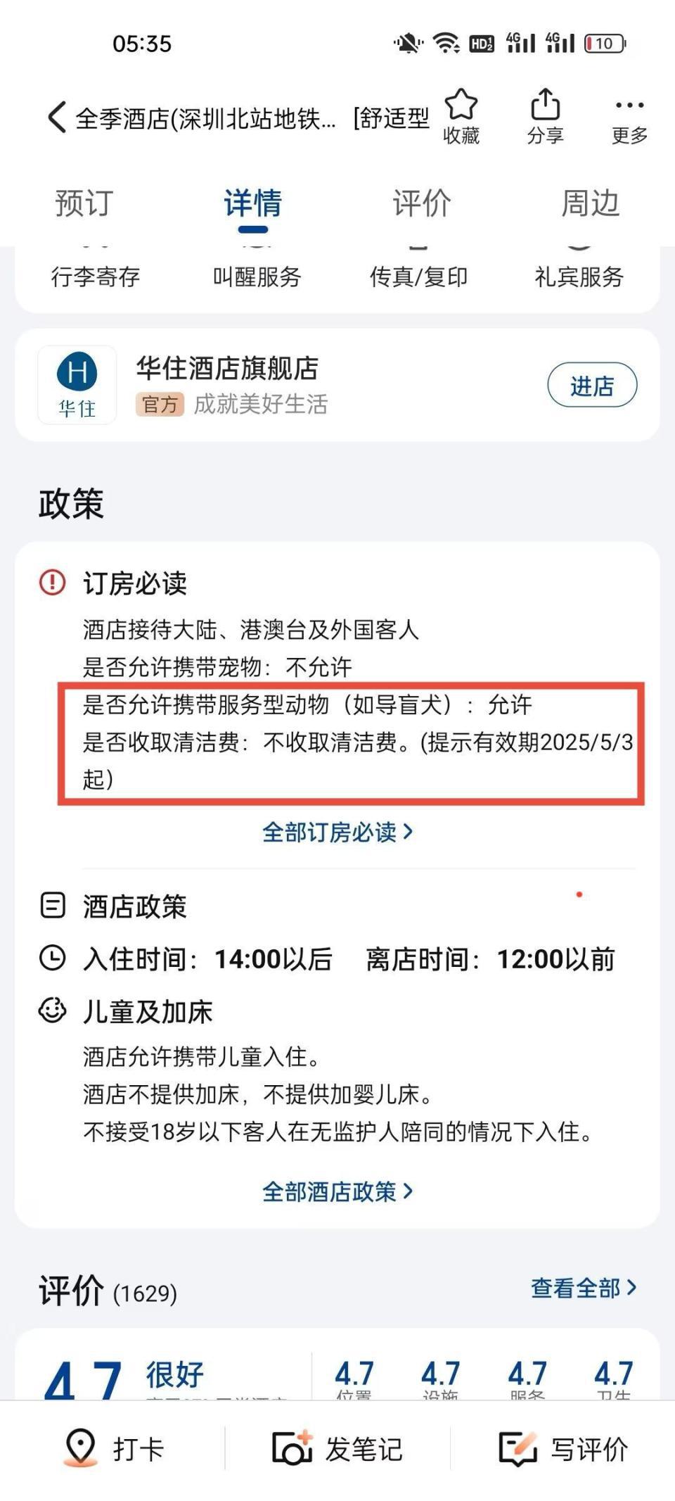 值得注意的是,事件曝光后,有网友发现涉事酒店已及时调整了相关入住政策。在其最新公布的入住须知中," 是否允许携带服务型动物(如导盲犬)" 的选项已明确标注为 " 允许 ",并特别注明 " 不收取清洁费 "。