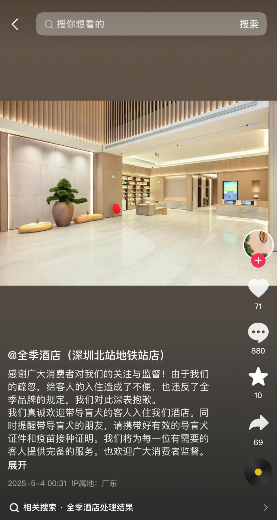 视障博主携带导盲犬入住全季被拒,涉事酒店致歉:违反了品牌规定