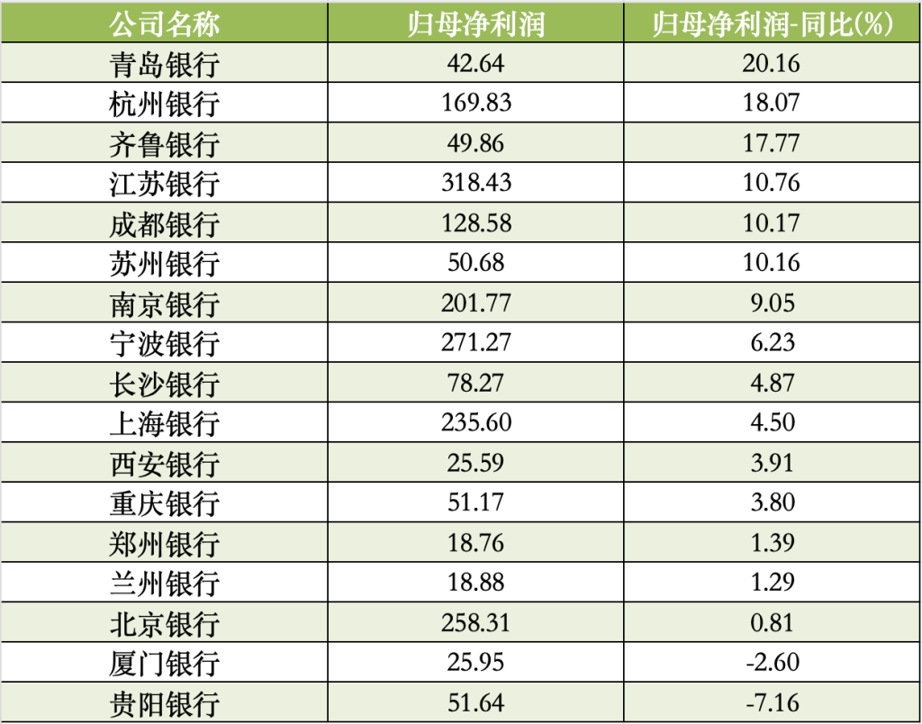 有2家A股上市城商行净利出现负增长,为厦门银行、贵阳银行,其归母净利润同比分别为-2.6%、-7.16%。