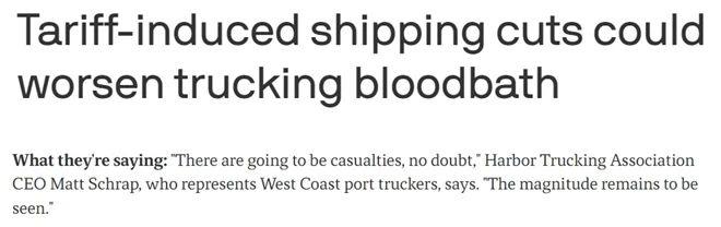 港口卡车运输协会首席执行官马特 · 施拉普表示,关税政策若继续下去,将严重影响整个物流行业," 卡车公司将失去业务,仓库也没有存储业务,甚至连码头装卸工也没有那么多工作了 "。