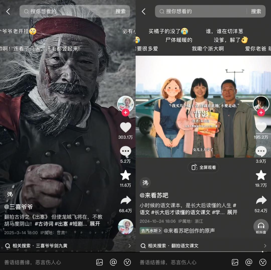 兼具童年回忆和经典文学,在短视频平台,语文课文正在成为创作者们新的灵感来源。以剧情演绎为主要方式,2024年下半年开始,包括@来看苏吧、@三喜爷爷、@郝家豁等在内,一批语文翻拍账号开始涌现,这些账号单条视频的爆款率极高,并都在不到半年时间实现百万级涨粉。