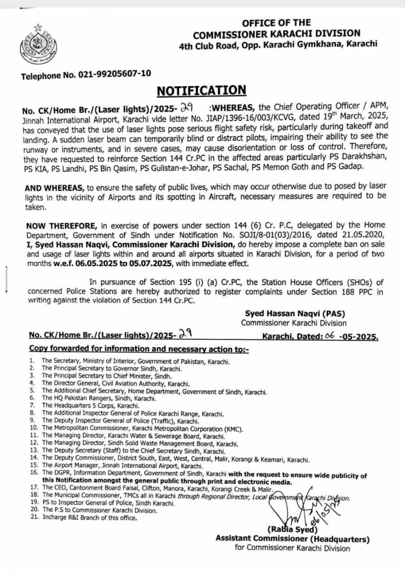 根据卡拉奇专员Syed Hassan Naqvi发布的通知,该限制是根据《刑事诉讼法》第144条实施的,将于2025年5月6日至7月5日有效。