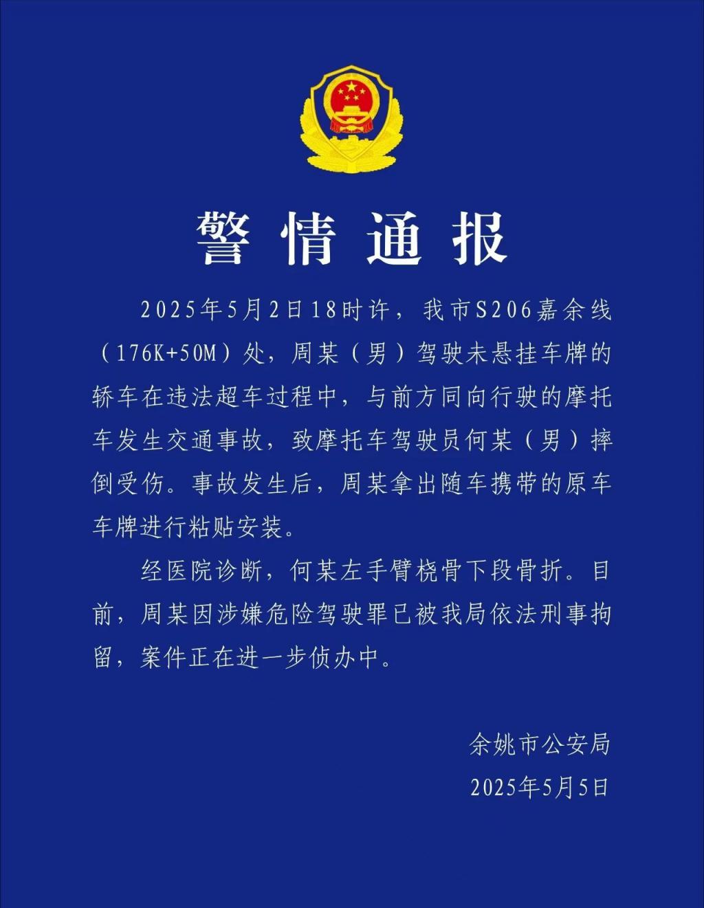 5 月 5 日,浙江余姚市公安局发布警情通报: