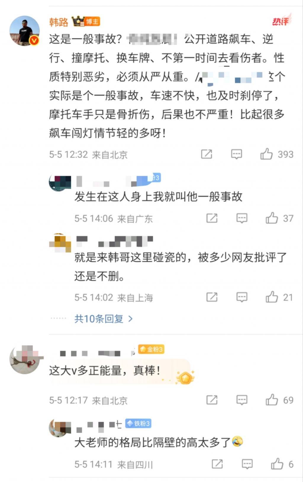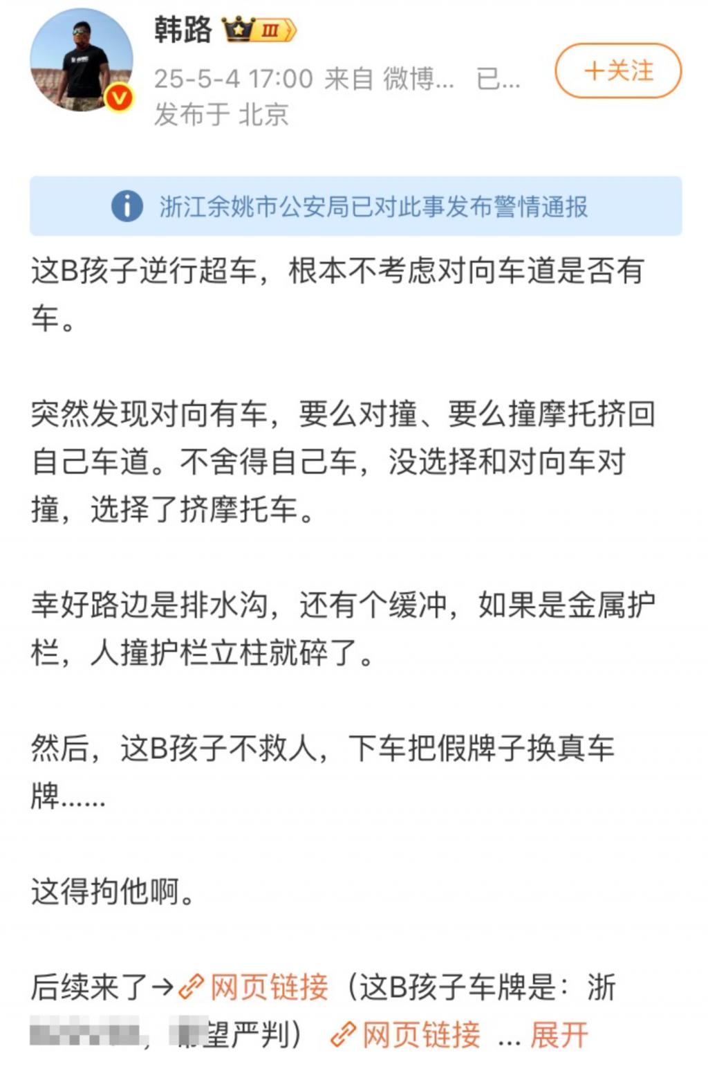 加 V 认证博主、资深车评人韩路发微博称:幸好路边是排水沟,还有个缓冲,如果是金属护栏,人撞护栏立柱就碎了。韩璐认为,(小车驾驶员)公开道路飙车、逆行、撞摩托、换车牌,建议从严从重(处理)。