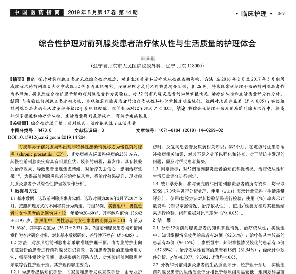 让人诧异的是,还有一篇题为《综合性护理对前列腺炎患者治疗依从性与生活质量的护理体会》的论文,其中称,选取前列腺炎患者52例,实验组中,男性患者与女性患者的比例为14∶12,参照组中,男性患者与女性患者的比例为16∶10。前列腺炎患者中出现了“女性患者”。