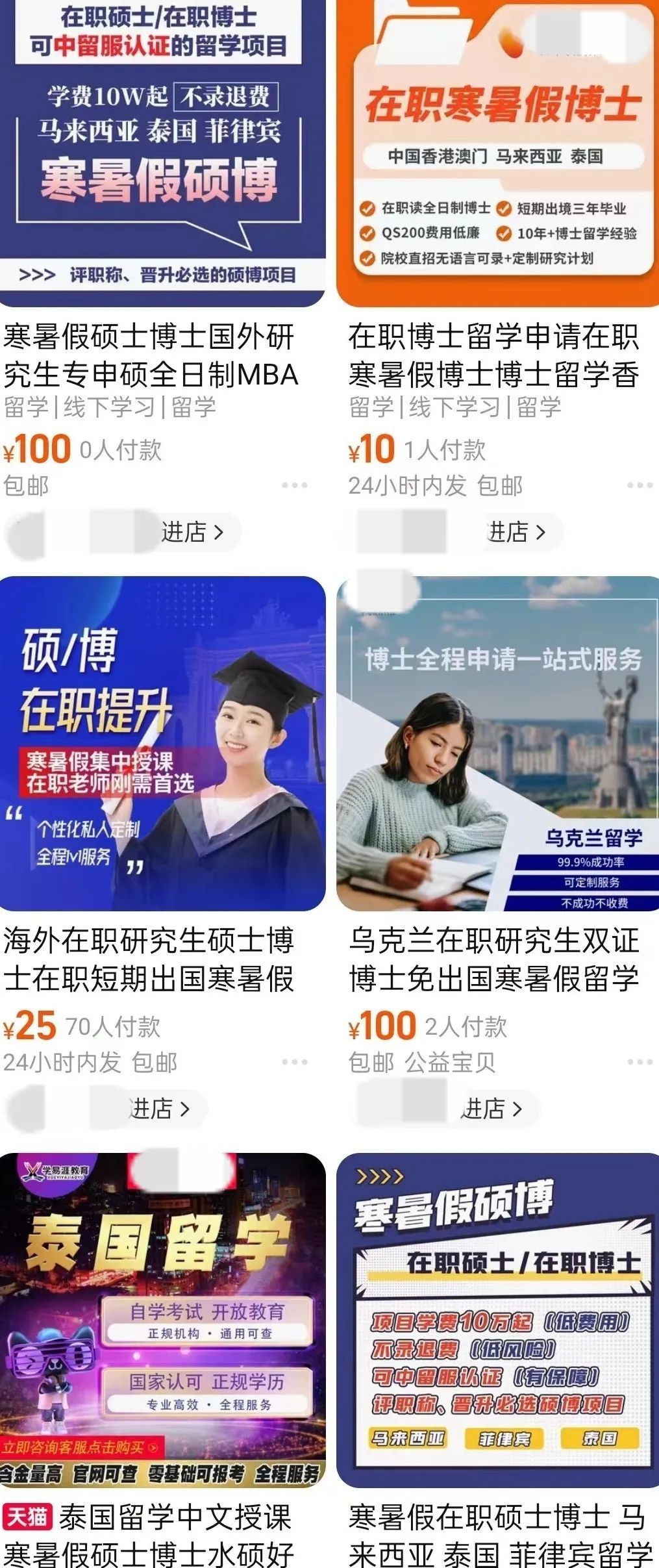 储朝晖的警示,在市场上已经有一定端倪。记者在某电商平台发现,不少中介以“无需辞职”“网课就读”“短期出境”等为宣传噱头招揽生源,有中介直接用“寒暑假硕博”作为特定名词吸引关注。
