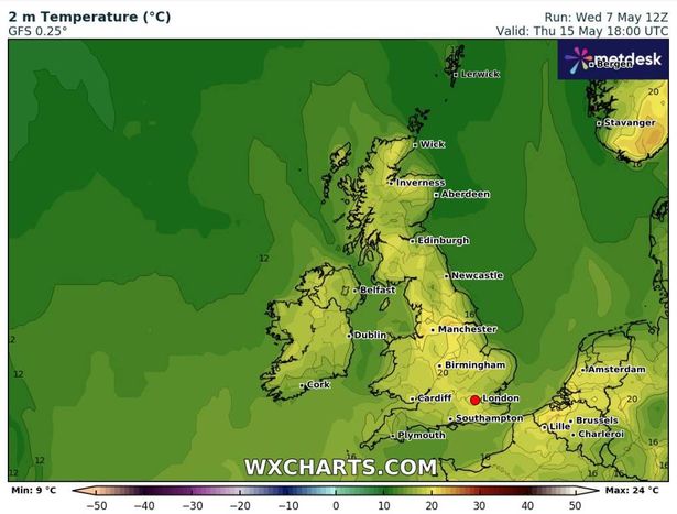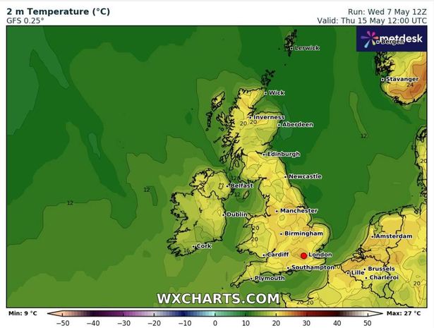 根据WX Charts的最新地图,5月14日(周三)下午晚些时候和5月15日(周四),伦敦的气温将达到27摄氏度。但不仅仅是首都得到了所有的乐趣,热度将传遍全国。