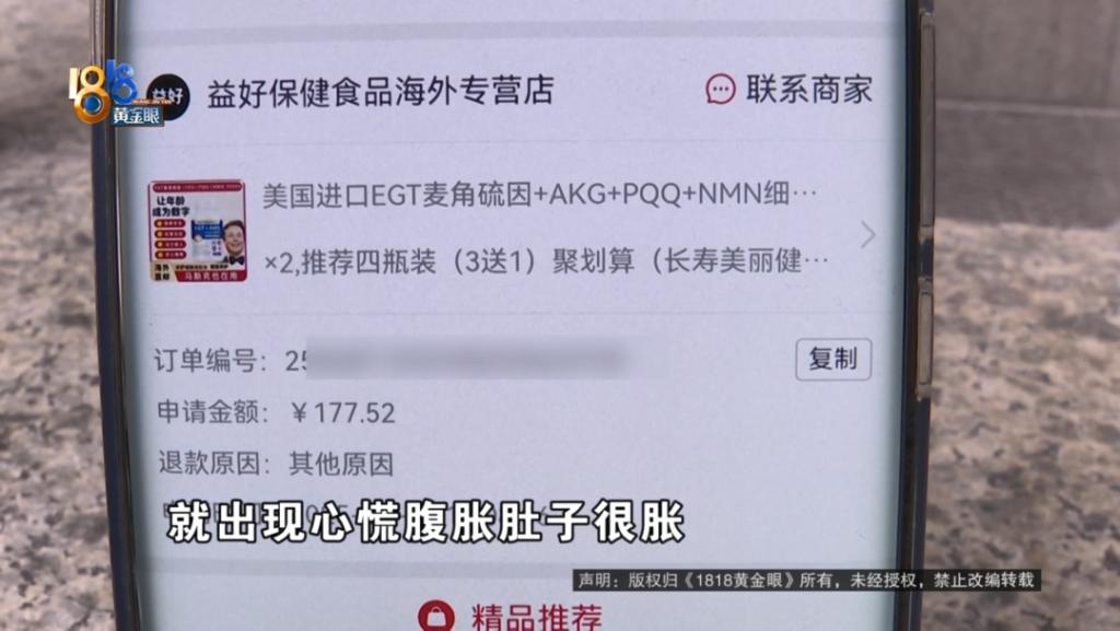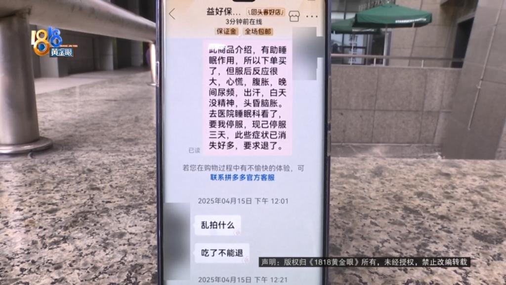 叶奶奶说感觉身体异样后,她联系了商家,对方说" 乱拍什么 吃了不能退 ",上个月她已经把东西全都退了回去。