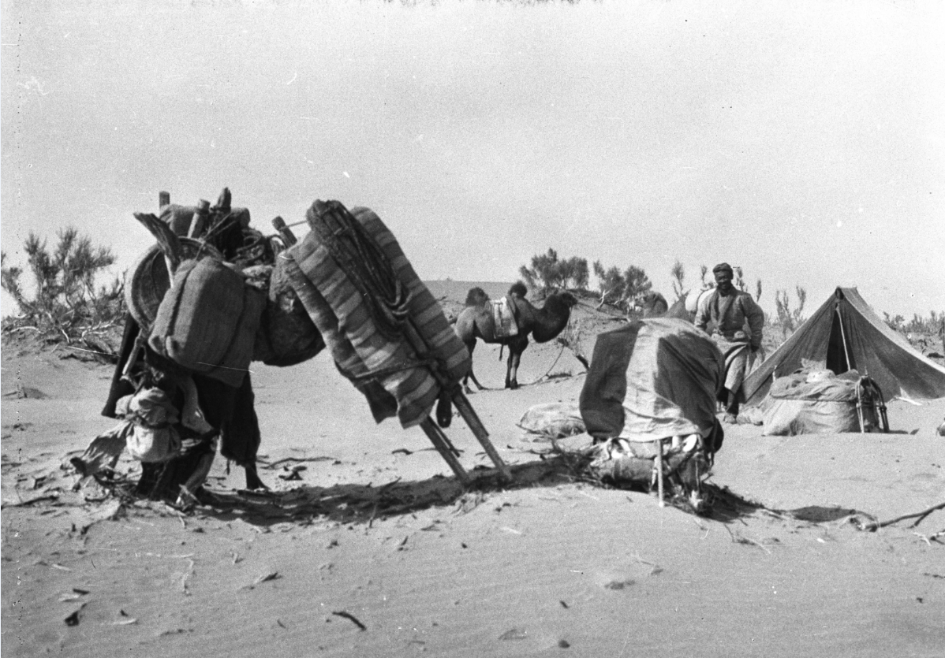 商队的日常活动是不断地行进和扎营,对于骆驼而言就是日复一日地装货和卸货,它们往往体现出服从和秩序的一面。比如拉铁摩尔生动记录的卸货过程: