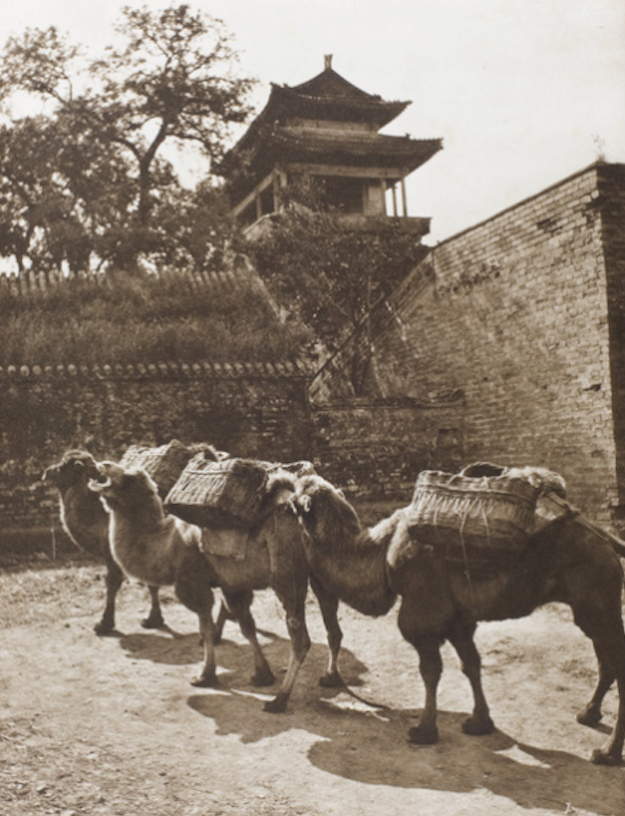 并不是所有骆驼都适合长途运输,体形矮胖的骆驼更能节省体力,而那些高大的品种更多地被使用于北方城市的运输,比如著名的阿拉善骆驼。拉铁摩尔认为阿拉善骆驼虽然力气更大,但因为体形高大,加之“出了名的野”,因此其舞台不在戈壁荒漠,而是在城市和客栈,比如从张家口往北京运送羊毛、从西山往北京运煤。他点到了骆驼与近代北方城市的联系,而这正是香港岭南大学张雷教授在论文《城市化骆驼:北京的骆驼1900—1937》(Urbanizing Camels: Camels in Beijing, 1900-1937)中研究的动物史现象。在清末民国时期的照片等图像中,可以看到骆驼在北京城墙下行进的画面,拉铁摩尔自己就有一张骑着骆驼在北京拍摄的照片。骆驼在街道上与人类的杂处可能是前现代时期城市的常见情景,随着城市化进程的发展,由于卫生方面的考虑,骆驼无法直接入城,只能每日“通勤”,在黎明之前赶到城门口,等待城门打开以便交接货物。如汤因比目睹的历史性一幕: