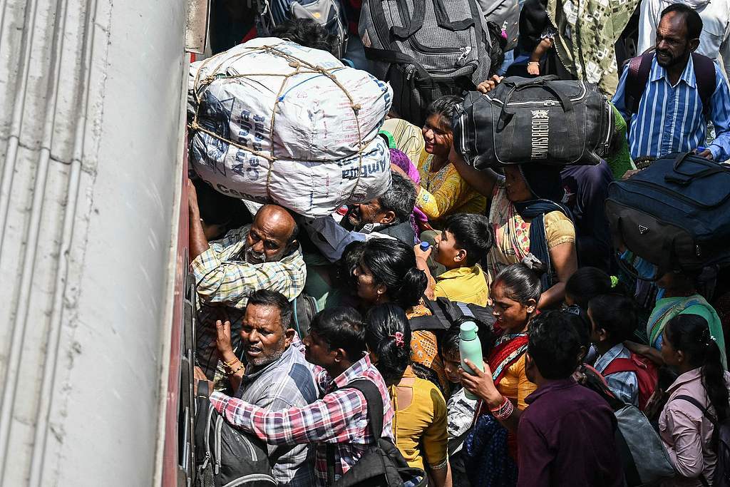 当地时间2025年5月10日,印控克什米尔查谟,民众在查谟塔维火车站试图登上超载的列车,离开城市。