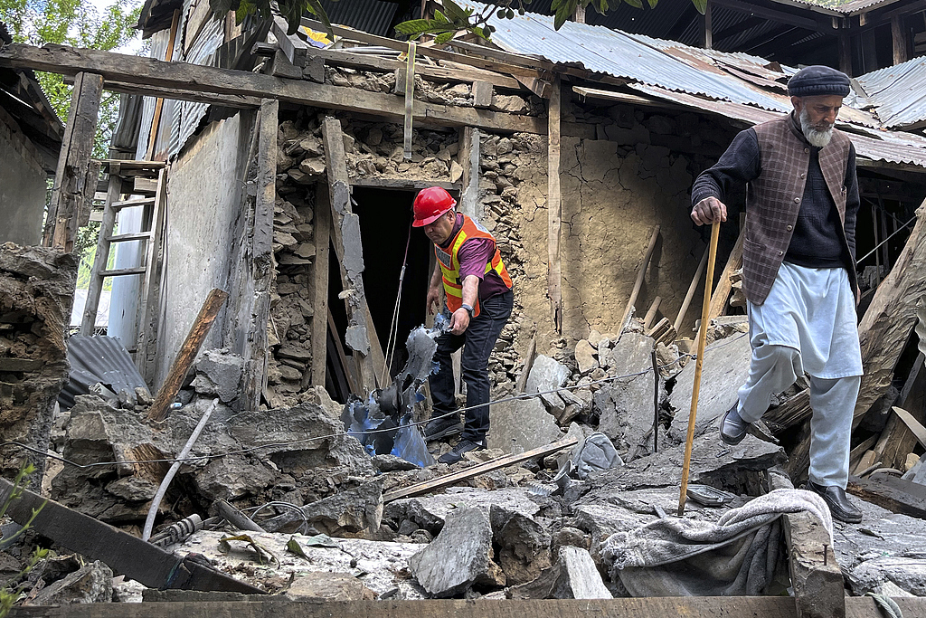 当地时间2025年5月10日,巴基斯坦控制的克什米尔尼拉姆谷区沙科特,农民与救援人员共同查看因印度炮击造成的房屋损坏。