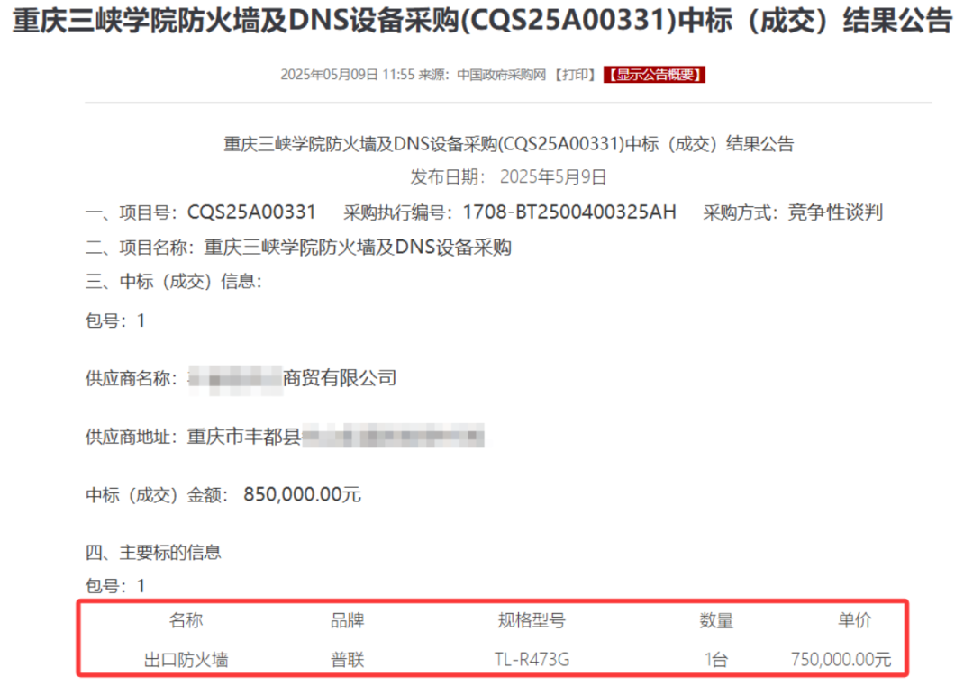 近日,有网友发消息称,2025年5月发布的《重庆三峡学院防火墙及DNS设备采购(CQS25A00331)中标(成交)结果公告》中,重庆三峡学院采购的“普联TL-R473G出口防火墙”,中标价格为75万元一台,但该型号产品在某电商平台普联官方旗舰店售价仅299元,质疑其中标价格不合理。