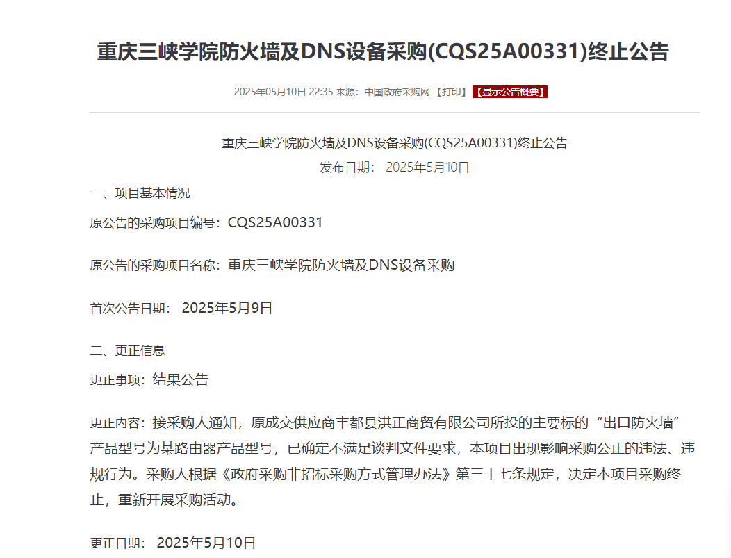 极目新闻记者就此事搜索发现,2025年5月10日晚10时许,中国政府采购网发布了一则《重庆三峡学院防火墙及DNS设备采购(CQS25A00331)终止公告》,更正信息一栏中显示:“接采购人通知,原成交供应商丰都县洪正商贸有限公司所投的主要标的‘出口防火墙’产品型号为某路由器产品型号,已确定不满足谈判文件要求,本项目出现影响采购公正的违法、违规行为。采购人根据《政府采购非招标采购方式管理办法》第三十七条规定,决定本项目采购终止,重新开展采购活动。”更正日期为2025年5月10日。