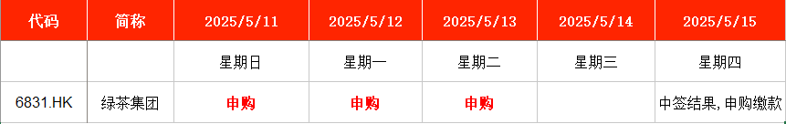 Wind数据显示,绿茶集团(06831.HK)在本周一至周二(5月12日-5月13日)继续申购。