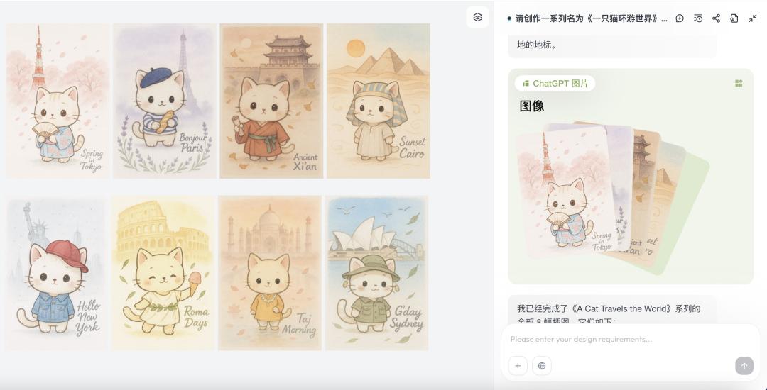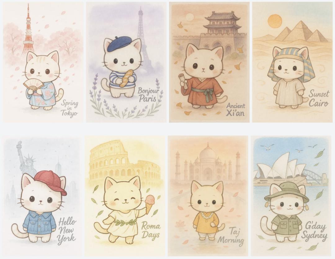 帮我画一组“猫猫去世界各地旅行”的插画系列,总共8张图,每张都画一只米白色、站着走路的Q版猫猫,穿着当地的传统服饰,比如去日本就穿和服,去法国就带贝雷帽,去西安就穿唐装。猫的形象要一模一样,要站在画面中间偏下,后面是有代表性的地标,比如东京的街道、巴黎铁塔、西安城墙等等,但背景不要太复杂。画风要偏日系插画,线条细一点,颜色柔和一点,每张右下角能加一句旅游口号,比如“Spring in Tokyo”。整套适合做小红书日签那种风格,尺寸是3:4。