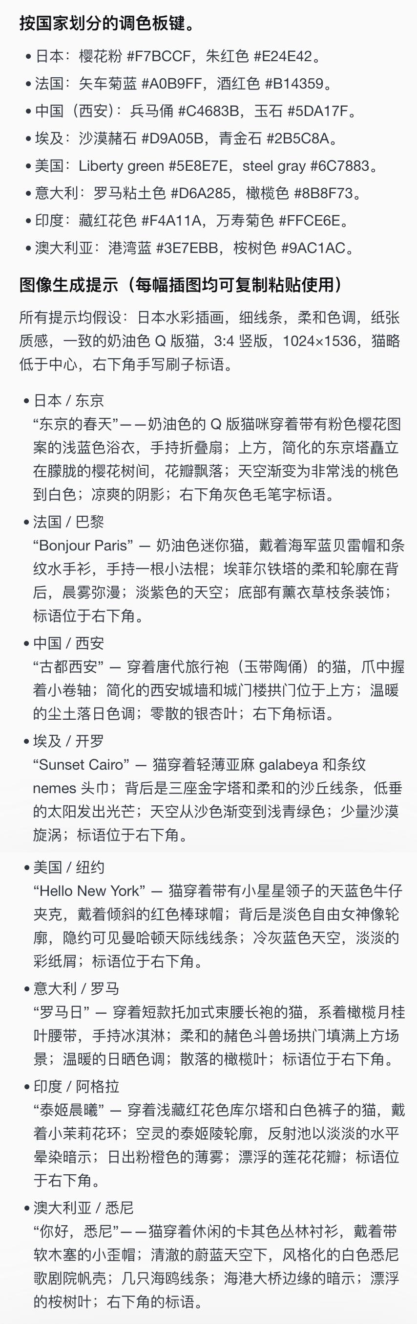 不仅写了通用性的设计规范,确定好的IP的样式和总体布局,然后,还列了8个城市,给每个城市,单独固定了调色板和单独的Prompt。。。