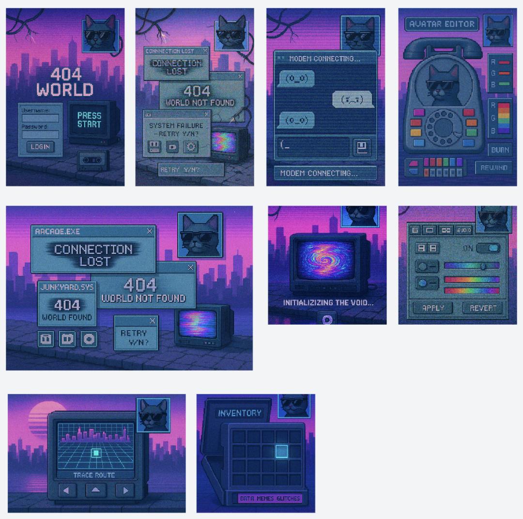 还做了一整套游戏UI,我超级喜欢的蒸汽波+复古像素的风格。是我心中的404世界,那种在虚拟空间中,被废弃的城市。