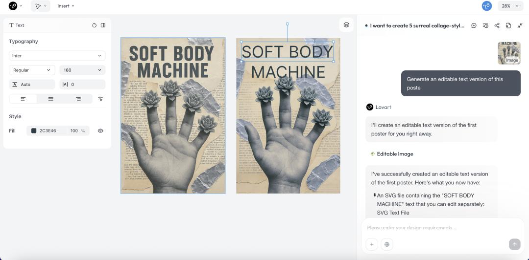 只不过现在Lovart虽然有了这个意思,会把字符、位置几乎完美的还原,但是把背景做了一些很细节的微调,字体样式也还没有保持住,不过至少看到了希望,未来可期。