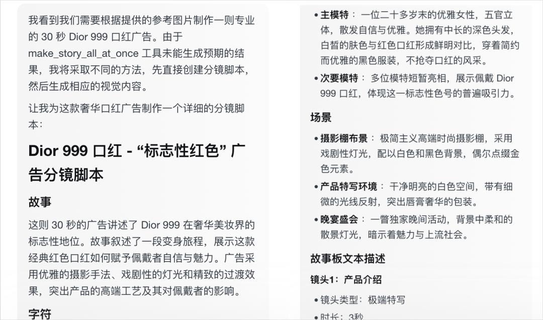 Lovart先分析了图像,然后写了一段非常详细的,广告视频脚本。