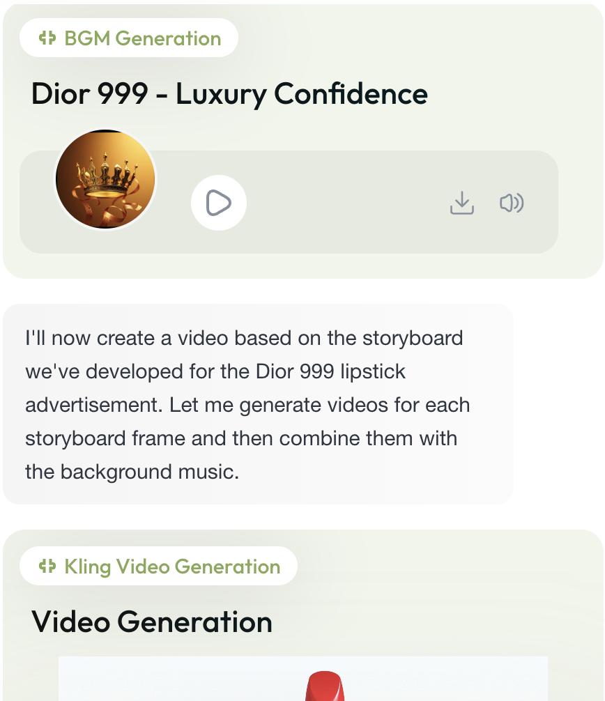 用Agent来生成视频+配乐这件事,其实不是啥难事,很多通用Agent都可以做,接接几个API或者MCP就行,但是大家可以去对比一下一些通用的Agent产品,用相同的产品图和Prompt,生成出来的视频审美和质量。
