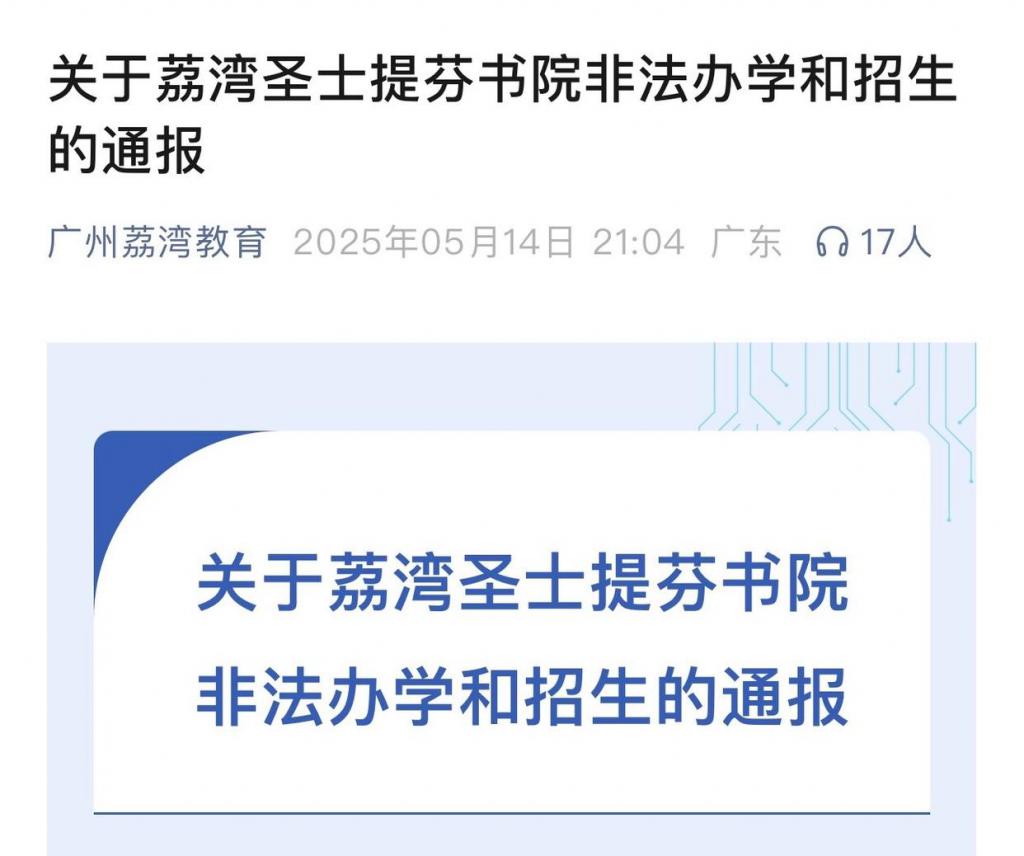 5 月 14 日,广州市荔湾区教育局发布关于荔湾圣士提芬书院非法办学和招生的通报。