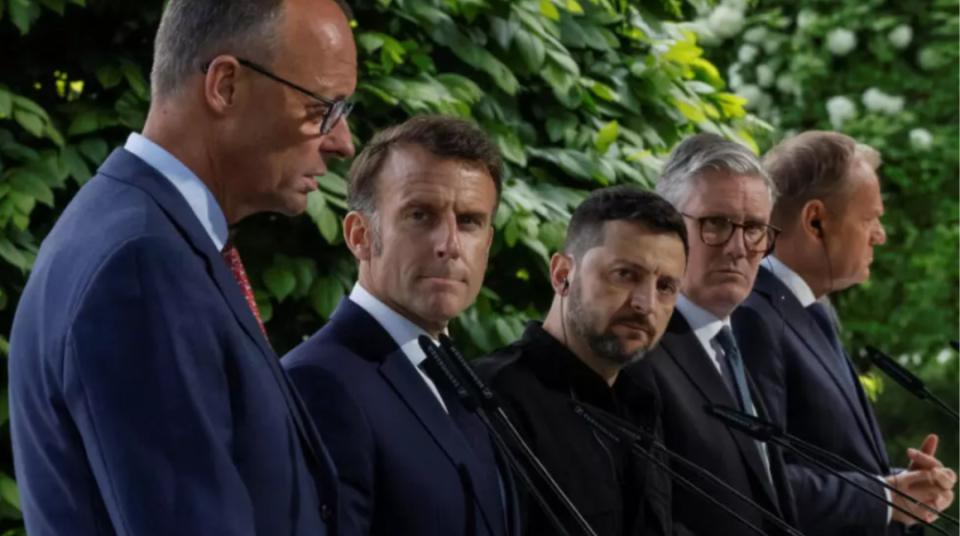 5 月 10 日,德国总理默茨(左起)、法国总统马克龙、乌克兰总统泽连斯基、英国首相斯塔默、波兰总理图斯克在基辅会谈后,举行联合记者会。