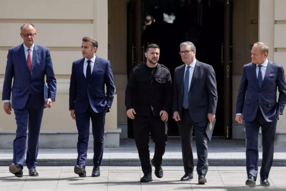 5 月 10 日,德国总理默茨(左起)、法国总统马克龙、乌克兰总统泽连斯基、英国首相斯塔默、波兰总理图斯克在基辅会谈。