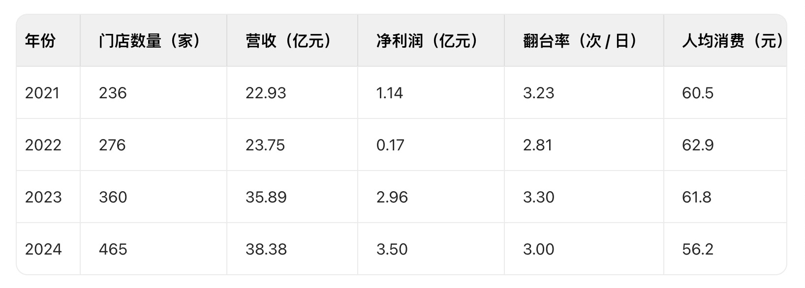 在2021年至2024年,它的营收虽然在稳步扩张,分别实现22.93亿元、23.75亿元、35.89亿元、38.38亿元;同期净利润分别为1.14亿元、1657.9万元、2.96亿元和3.5亿元。但实际上,它的营收的增长主要靠门店的扩张来驱动——同期,绿茶的新开餐厅数量分别为59家、47家、89家和120家,关闭餐厅为3家、7家、5家和15家。