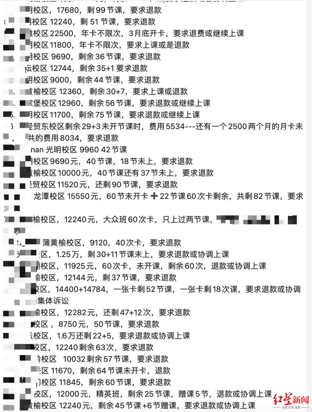 红星新闻注意到,在东方启明星突然“停摆”后,有家长组群登记预付费金额、剩余课时等信息。红星新闻在其中一个群内看到,已有超过140人登记,大多数预付费金额在1万元左右,其中不乏登记“22500元、年卡不限次、3月底开卡”的家长。据初步统计,仅该群内家长登记未退费超百万元。而家长诉求几乎都为“要求退款或继续上课”。
