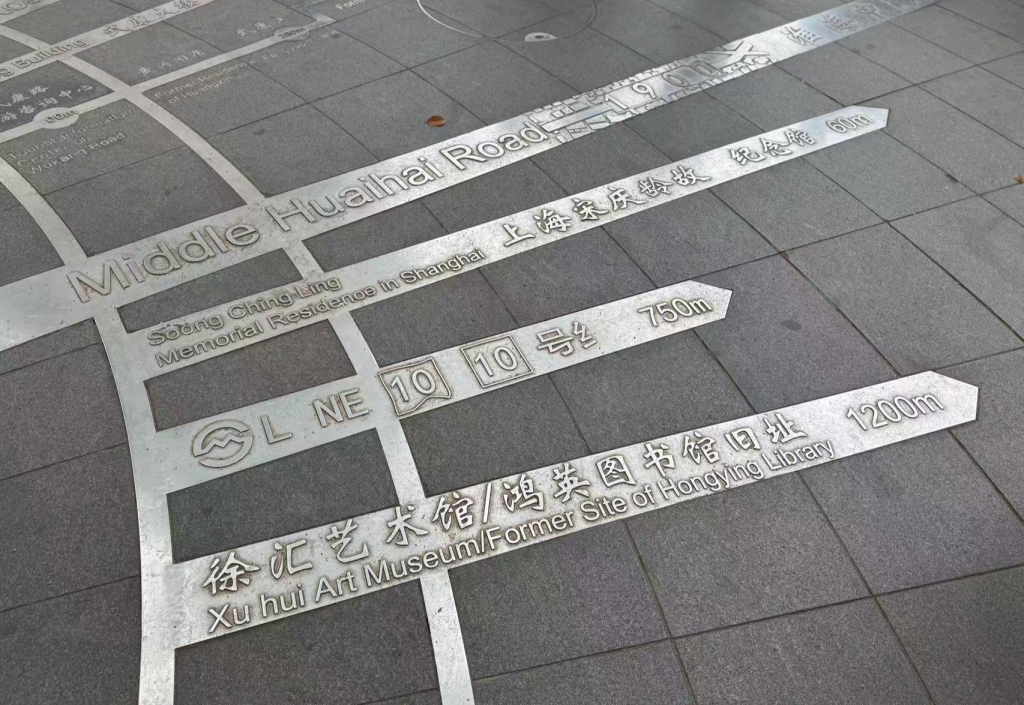 天平路淮海中路口的锐角区域是武康大楼最佳拍摄点位,人行道原本宽2米,大量游客一度是站在车行道上拍照打卡,造成了安全隐患。针对此乱象,王林团队在2020年受邀进行微更新,将该转角空间向外拓展3.6米,形成了约500平方米的源点广场。以树池为原点,广场地面嵌入了放射状的金属导航线,360度指向周边的历史文化资源:徐家汇源(900m)、徐汇艺术馆(1200m)、宋庆龄故居纪念馆(60m)。由于导航体系以广场为圆心360度放射,除了朝着武康路的方向以黄兴旧居、武康庭、巴金故居串联成线以外,很多景点因方位上南辕北辙尚未转化为打卡路线。