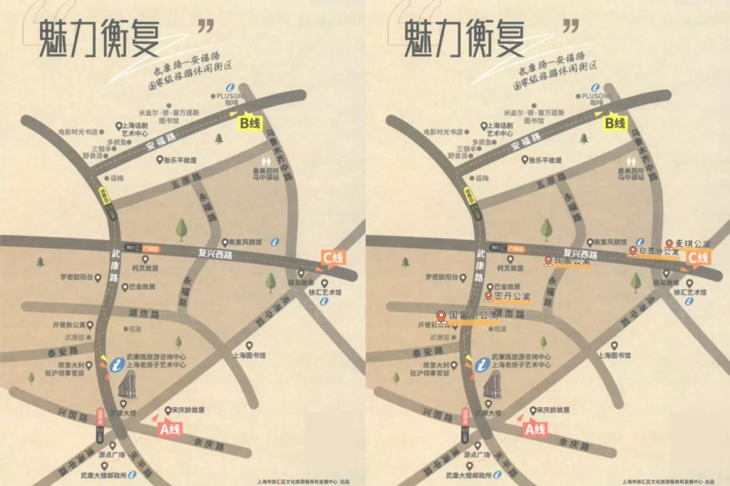 武康路旅游咨询中心提供的魅力衡复街区漫步地图。左图为固有路线,右图在C路线(1.2公里)加入5个转角公寓打卡点,丰富漫步体验。鲁怡 制