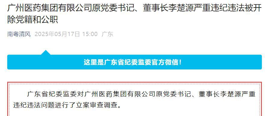 5 月 17 日,广东省纪委监委发布消息,广州医药集团有限公司原党委书记、董事长李楚源被 " 双开 " 并移送审查起诉,按规定撤销其全国五一劳动奖章、广东省五一劳动奖章、广东省劳动模范等荣誉称号。