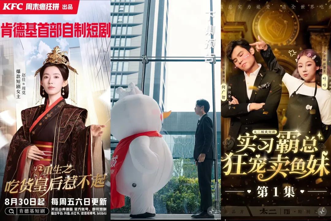 比如品牌端,在国产美妆品牌率先享受到首波营销红利后,近百家大牌纷纷效仿,开启了“人均重生”——曾以“不做广告”闻名的星巴克,用短剧推进下沉市场;肯德基的《重生之吃货皇后惹不起》、蜜雪冰城的《雪王的穿越日记》、太二酸菜鱼的《实习霸总狂宠卖鱼妹》,各种“buff叠满”;香港的周大福,决定投入1亿美元资金,用于支持短剧公司及相关项目……