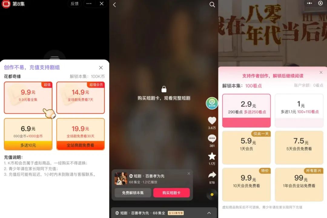 以抖音为例,新推出的“短剧卡”,允许用户选择“看广告解锁后续剧集”或“付费会员解锁全平台”。快手也上线了类似的“2.8元3天看8000+部剧”的会员服务体系。