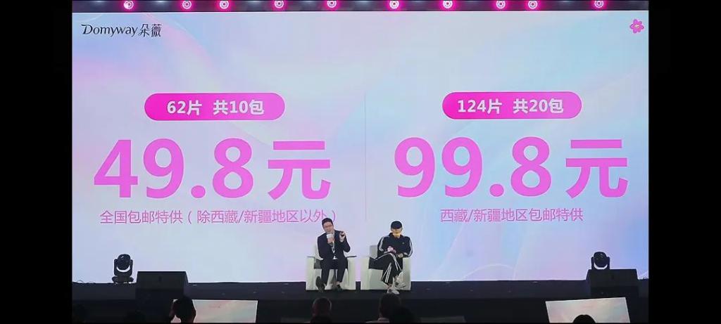 卫生巾售价在发布会现场公布,62 片 49.8 元,124 片 99.8 元,今晚七点发售。