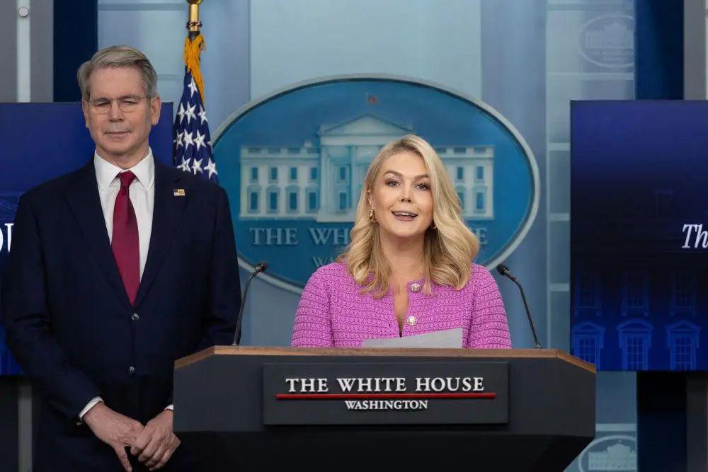 ▲ 4 月 29 日,美国白宫新闻秘书莱维特(右)与财政部长贝森特在白宫出席记者会。莱维特批评报道中有关亚马逊计划就商品售价标注加征关税成本的做法是 " 敌对且政治化的行为 "。(图片来源:新华社)