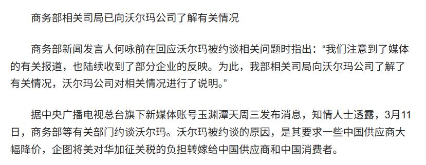 中国商务部于 3 月 11 日就沃尔玛向中国商户压价的问题约谈了这家美国超级零售商。在 5 月初中国商务部宣布考虑与美国谈判之后,沃尔玛被曝出已经向中国江浙等地的商户发出增加发货量请求,那些商户表示 " 沃尔玛已告知我们开始增加对美国的发货量,这样我们就不需要承担对中国商品征收新关税带来的额外成本 "。12 号中美发表联合声明后,进一步传出的消息称,中国多地厂商收到大量订单,美国采购商出现报复性大规模进货。