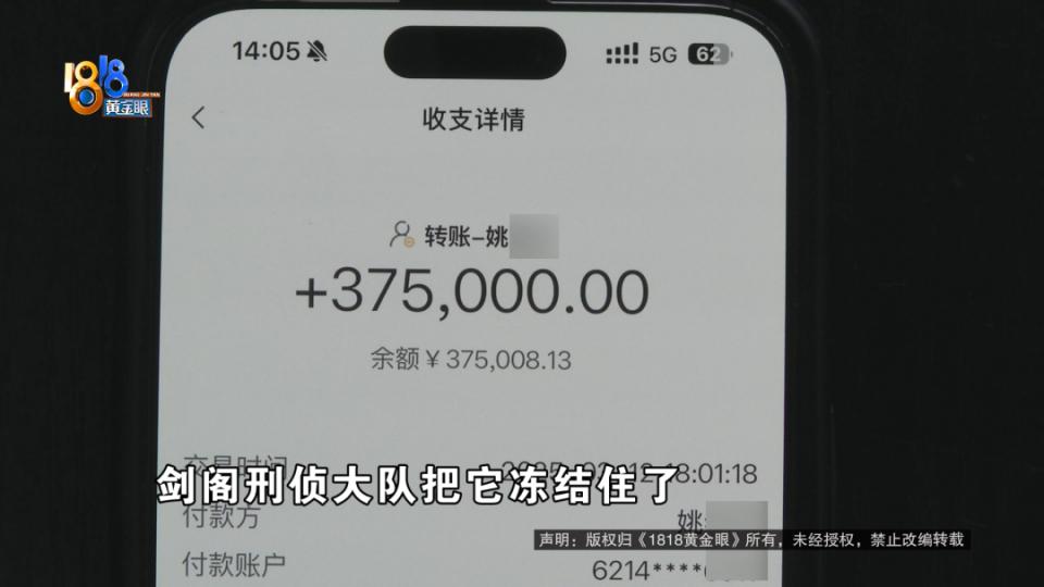 小陈介绍:" 银行说是四川当地刑侦,剑阁刑侦大队把它冻结住了。警方没有主动联系我,是我主动去网上找,网上找他们的区号加 110,一步一步慢慢找到,从反诈中心,找到他们刑侦大队。"