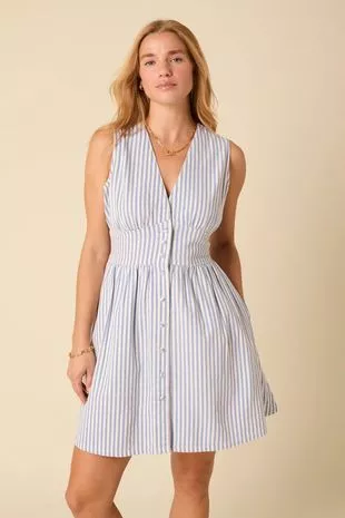 另一个不错的选择是白蓝条纹星光迷你裙,售价79英镑,既讨人喜欢又飘逸。它腰部有一个合身的面板,突出你的身材,喇叭形的迷你裙和无袖的身体,让你在炎热的天气里保持凉爽和微风。
