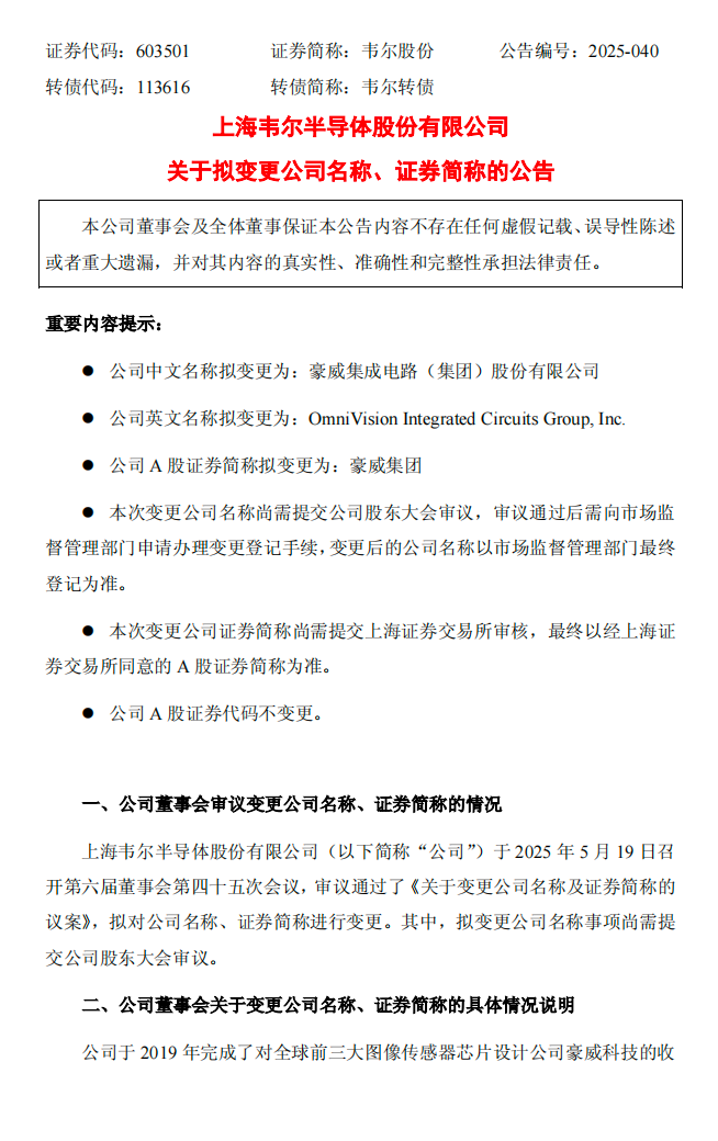 5月19日,上海韦尔半导体股份有限公司(韦尔股份,603501)发布公告称,公司拟将公司名称从“上海韦尔半导体股份有限公司”变更为“豪威集成电路(集团)股份有限公司”,证券简称从“韦尔股份”变更为“豪威集团”,证券代码保持“603501”不变。该议案已获第六届董事会第四十五次会议全票通过,尚需提交股东大会审议。