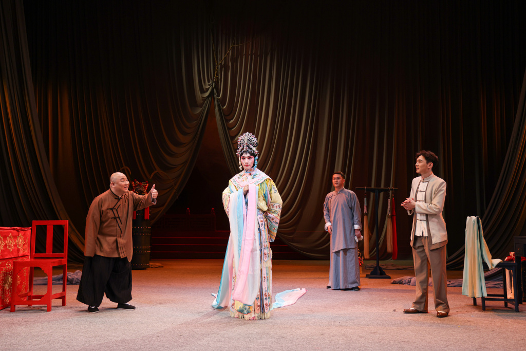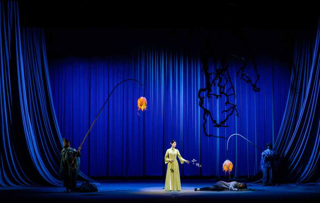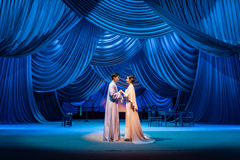 总之一切的表达都为了呈现一种新中式的美感。我特别喜欢布帘子,它不是“实”的,有意境又给人留有想象的空间。如果真弄一屋子实景,那是另一种排法,写实的排法,而我们既然要做新排经典,虚实相间反而更纯粹些,能把戏韵美的特质放大出来。