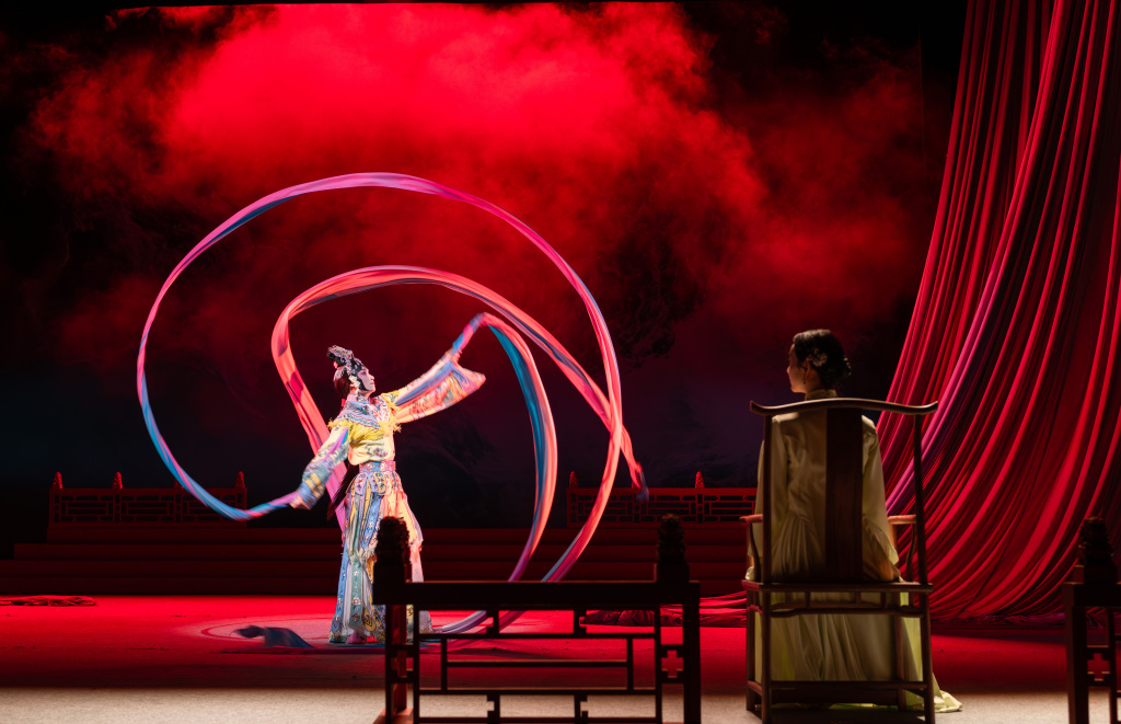 京剧是“放”,而昆曲本身就雅,比京剧还细腻,更符合这次我们提出要展现“诗韵美”的概念。您看第二幕中两位演员在拥抱、抚摸头发、脸颊时,这些动作都拉得极远,是一种虚拟性放大的表演,只是让他们去表现这种感受。第一幕里,二人借着教戏、学戏,就着拂尘的动作传递心绪,是那种说不清的暧昧和情思纠葛,都是若即若离、似有还无的写意式表达。