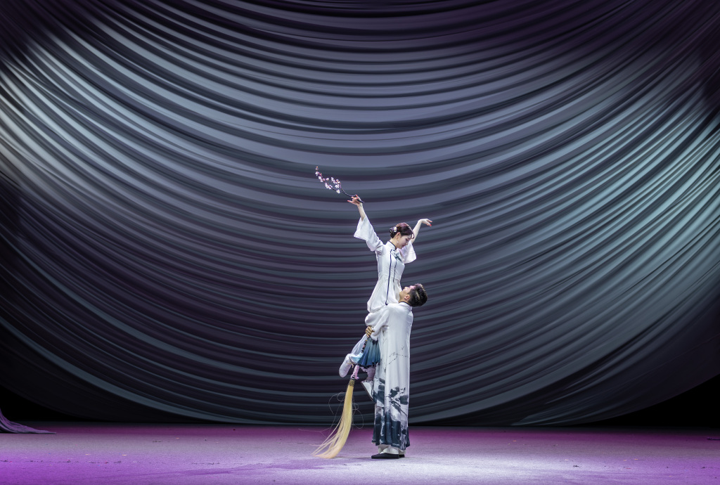 澎湃新闻:就像你刚才说的,莲生和玉春从相遇到相知相爱,舞台上的台词对白其实并不多,两人间你侬我侬的展现更多是通过舞台动作,擦身而过时的目光流转、两相依偎时的肢体表达,包括对多次出现的关键道具拂尘的运用。这些动作太美了,是不是也参考了一些昆曲的表现方式?
