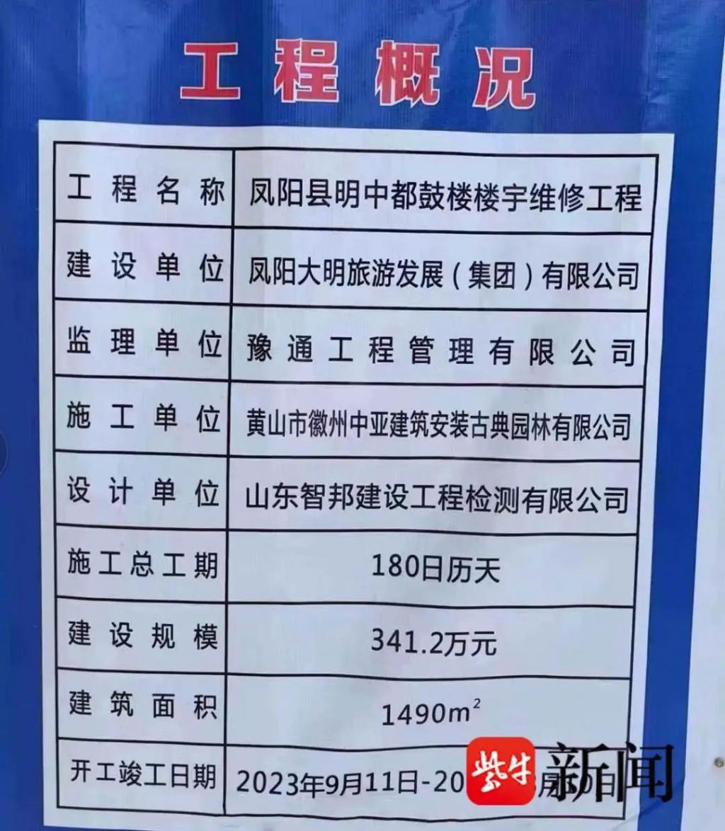 记者在居民提供的工程概况图中看到,凤阳县明中都鼓楼楼宇维修工程信息如下:建设单位为凤阳大明旅游发展(集团)有限公司,监理单位为豫通工程管理有限公司,施工单位为黄山市徽州中亚建筑安装古典园林有限公司,设计单位为山东智邦建设工程检测有限公司。工程工期 180 日历天,合同金额 341.2 万元,建筑面积 1490㎡,2023 年 9 月 11 日开工,2024 年 3 月 10 日竣工。