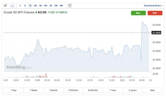 受此消息影响,周三亚盘,国际油价大幅上涨。WTI 原油期货一度上涨逾 2 美元,涨幅一度达 2.5%,现徘徊在 63 美元 / 桶左右。